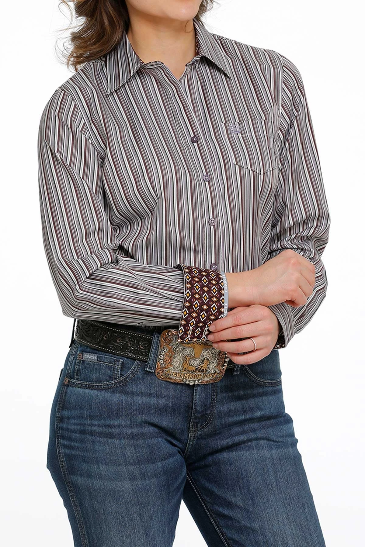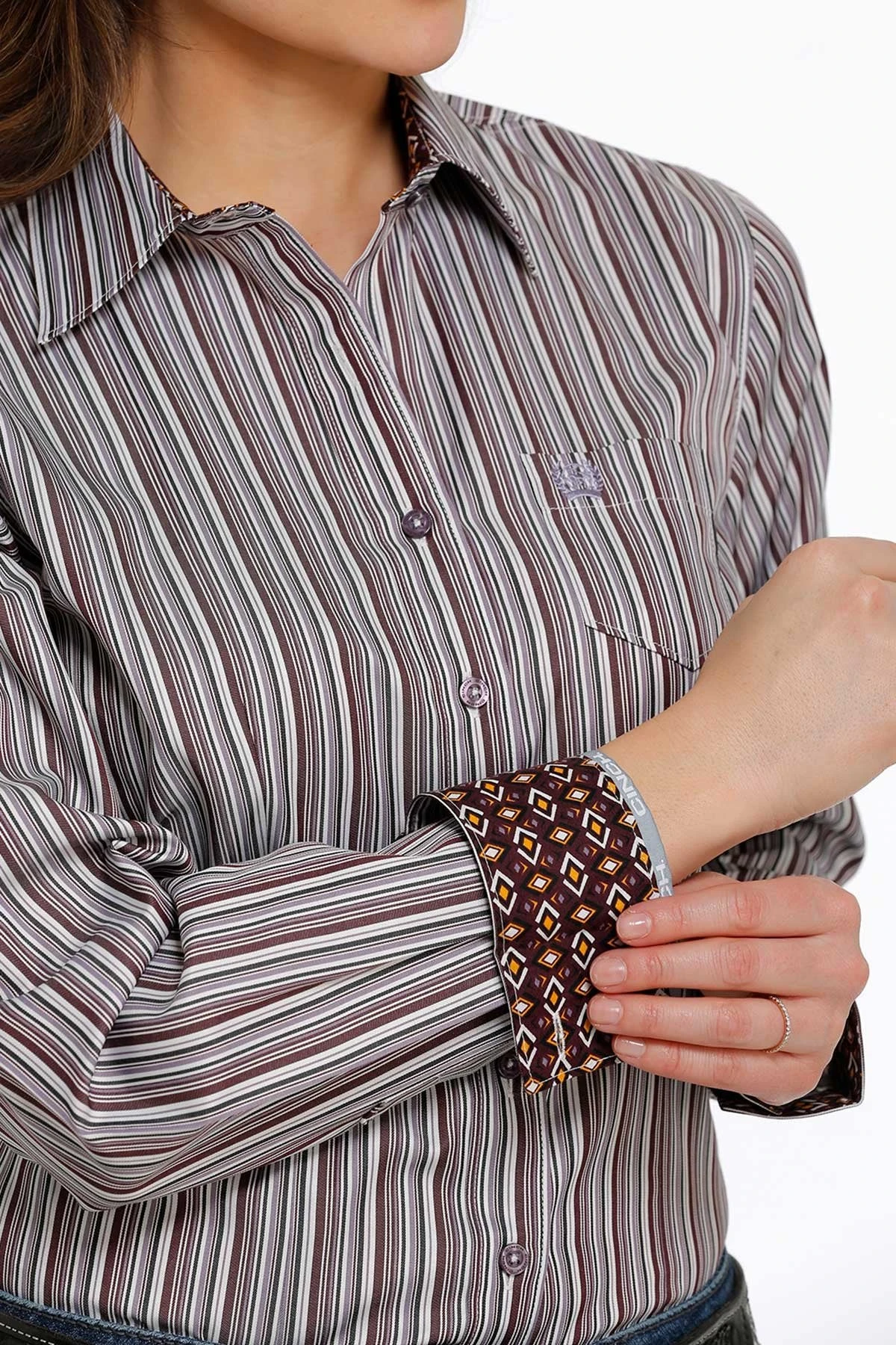 Purple, White and Black Stripe Long Sleeve Button Down Shirt.