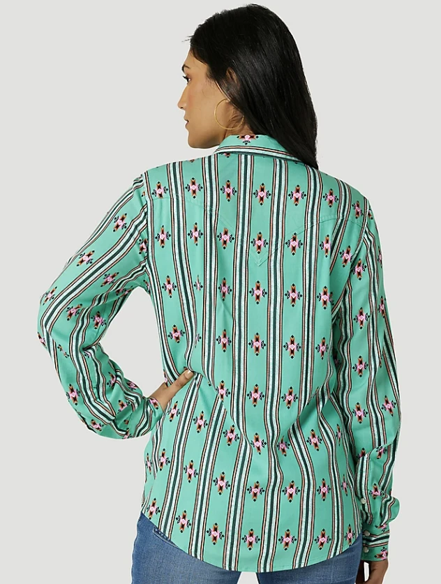 Green Southwestern Stripe Long Sleeve Snap Front Shirt.