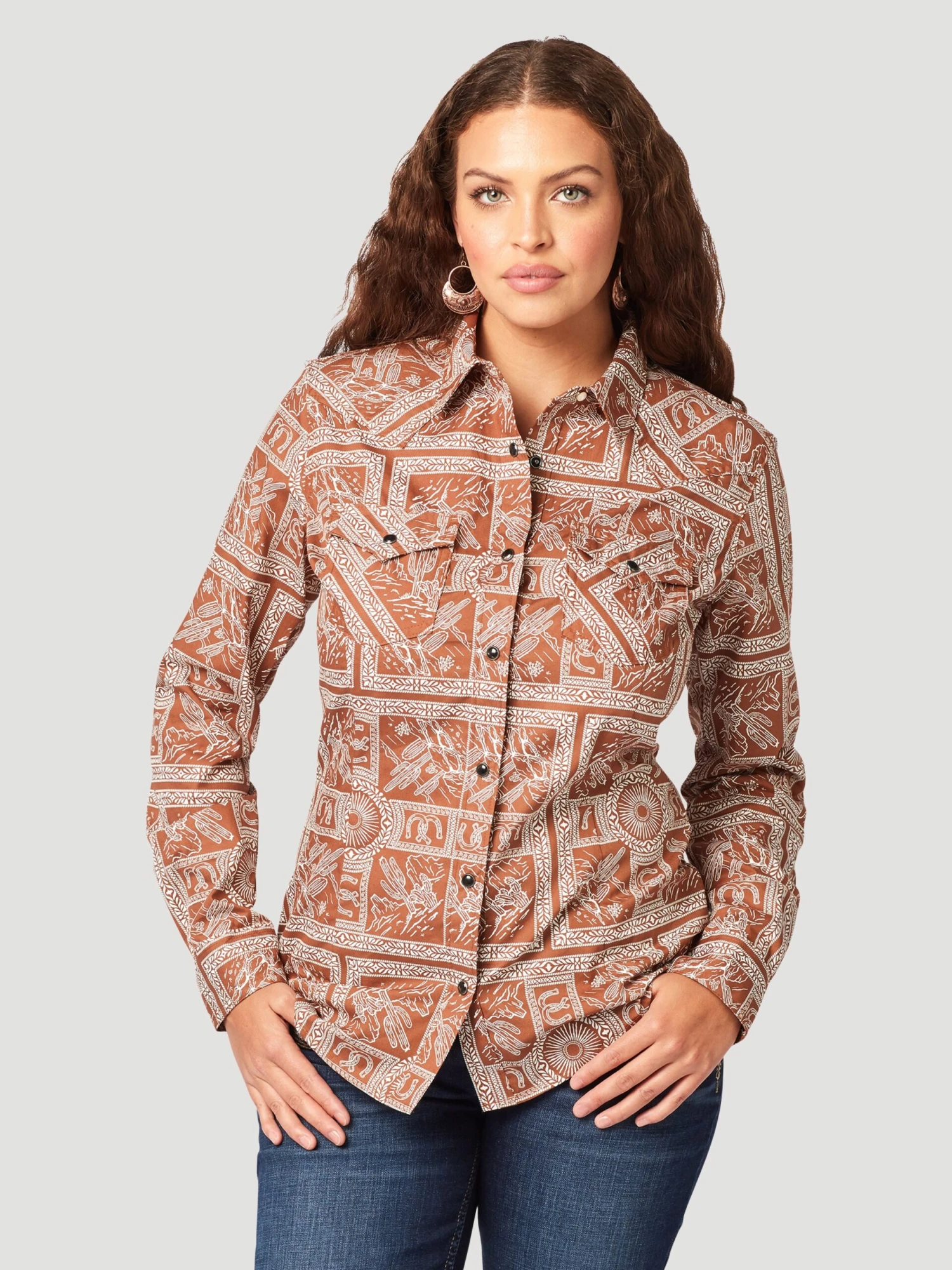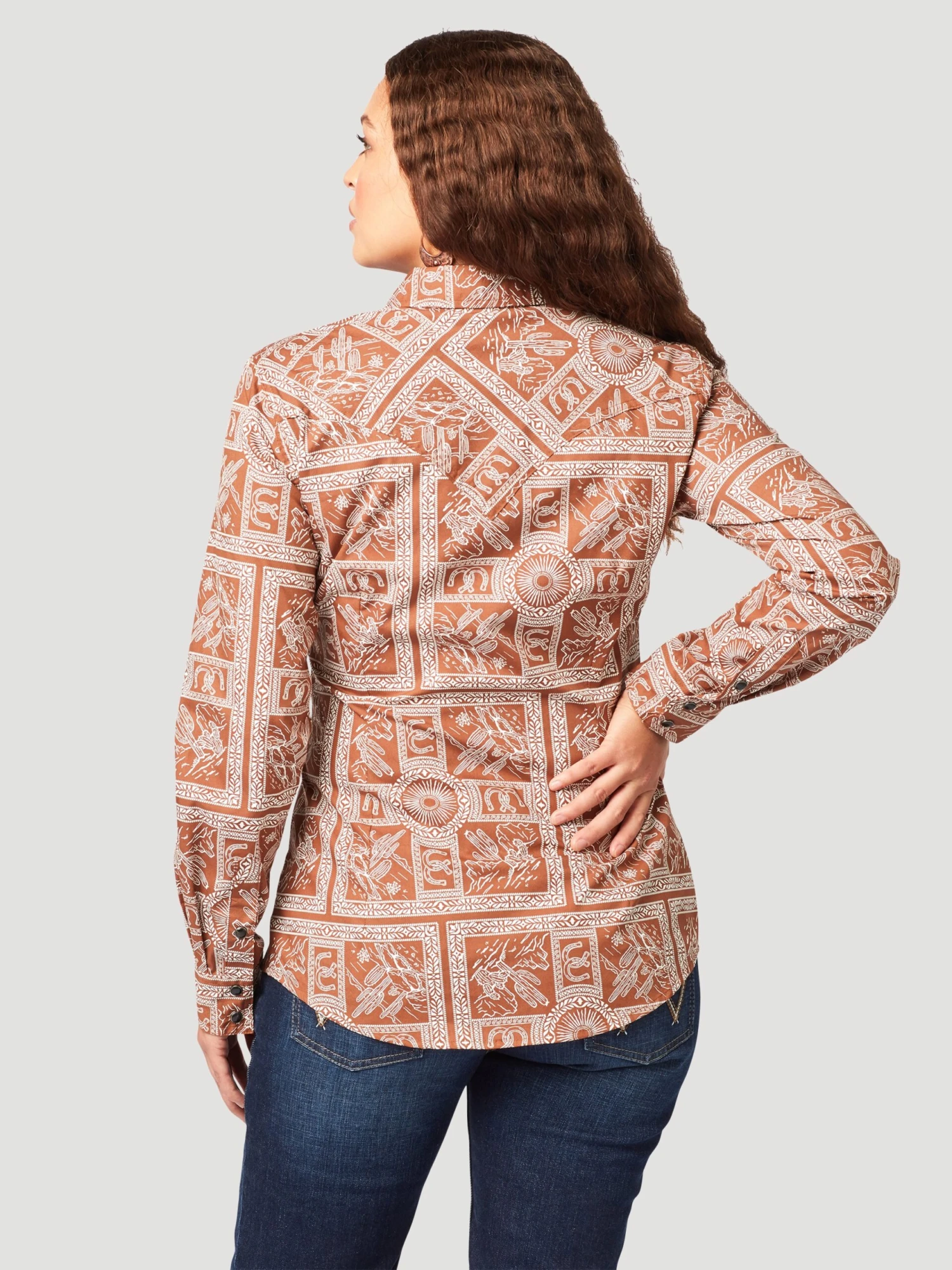 Burnt Orange and Tan All Over Western Print Long Sleeve Snap Front Shirt.